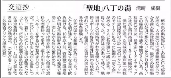 日経新聞「交遊抄」で八丁の湯が紹介されました。 2020.01.31 メディア掲載 平成2年1月31日(金)日本経済新聞 朝刊 文化面の「交遊抄」において、 外務省アジア大洋州局長 滝沢 成樹様に、八丁の湯での旧友の方々との親睦に関するエピソードをご寄稿いただきました。